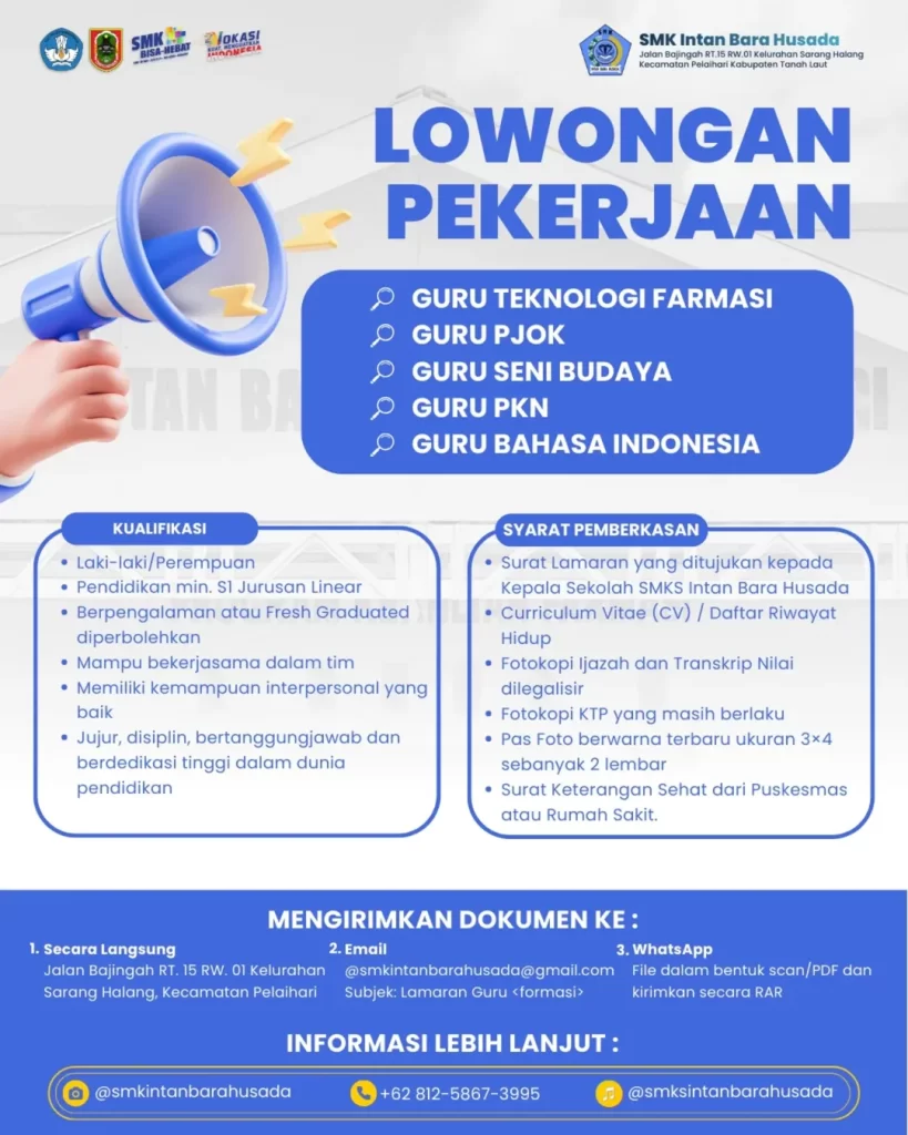 SMK Intan Bara Husada (Pelaihari, Kabupaten Tanah Laut, Kalimantan Selatan) membuka lowongan kerja tenaga pendidik untuk beberapa mata pelajaran. Kesempatan ini terbuka bagi pelamar lulusan S1 jurusan linear, baik yang sudah berpengalaman maupun fresh graduate yang siap mengajar dan berkembang di lingkungan sekolah.
