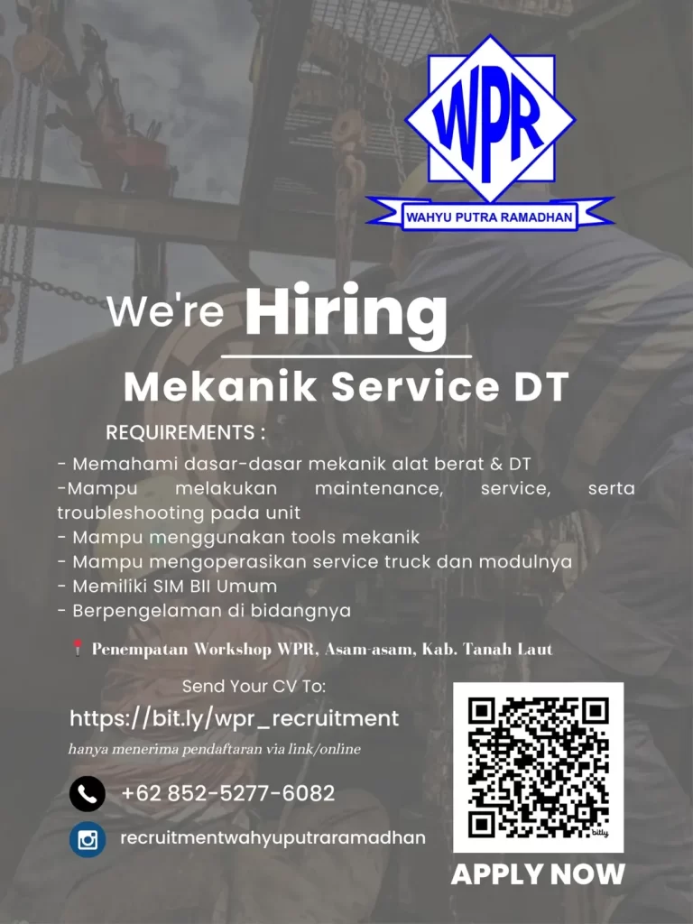WPR (Wahyu Putra Ramadhan) membuka lowongan kerja Mekanik Service DT untuk penempatan di Workshop WPR, Asam-Asam, Kabupaten Tanah Laut, Kalimantan Selatan. Posisi ini cocok bagi kandidat yang berpengalaman di bidang mekanik alat berat dan memiliki kemampuan perawatan serta perbaikan unit DT.