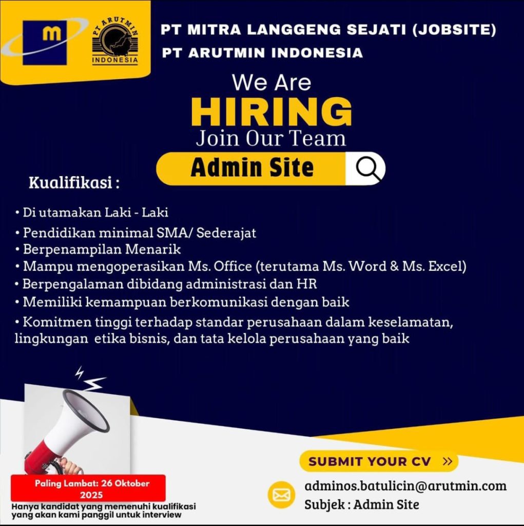 Dinas Tenaga Kerja dan Perindustrian Kabupaten Tanah Laut menginformasikan bahwa saat ini PT. Mitra Langgeng Sejati Jobsite – PT. Arutmin Indonesia membuka lowongan kerja untuk posisi:
