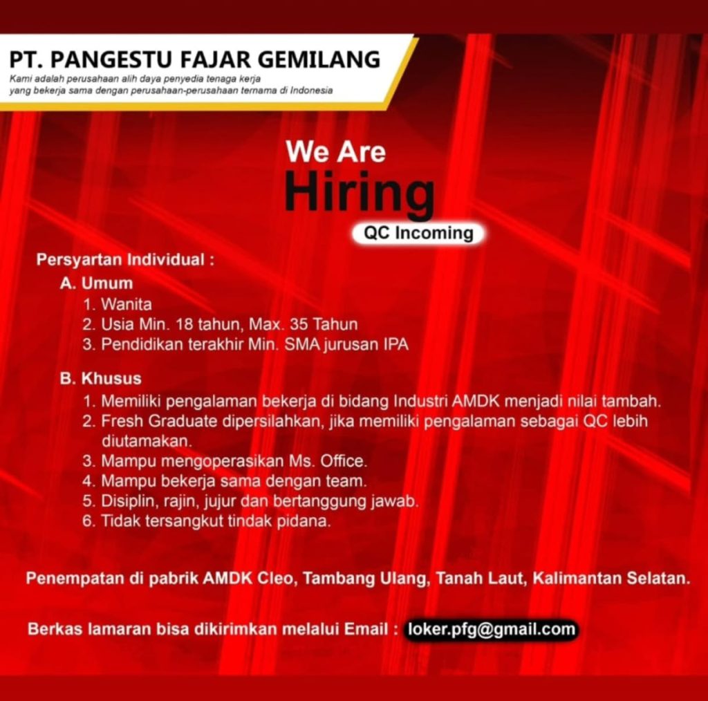 Dinas Tenaga Kerja dan Perindustrian Kabupaten Tanah Laut menginformasikan bahwa saat ini PT. Pangestu Fajar Gemilang (Penempatan Pabrik AMDK Cleo) membuka lowongan kerja untuk posisi: