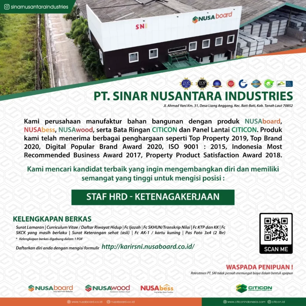 Dinas Tenaga Kerja dan Perindustrian Kabupaten Tanah Laut menginformasikan bahwa saat ini PT. Sinar Nusantara Industries membuka lowongan kerja untuk posisi: