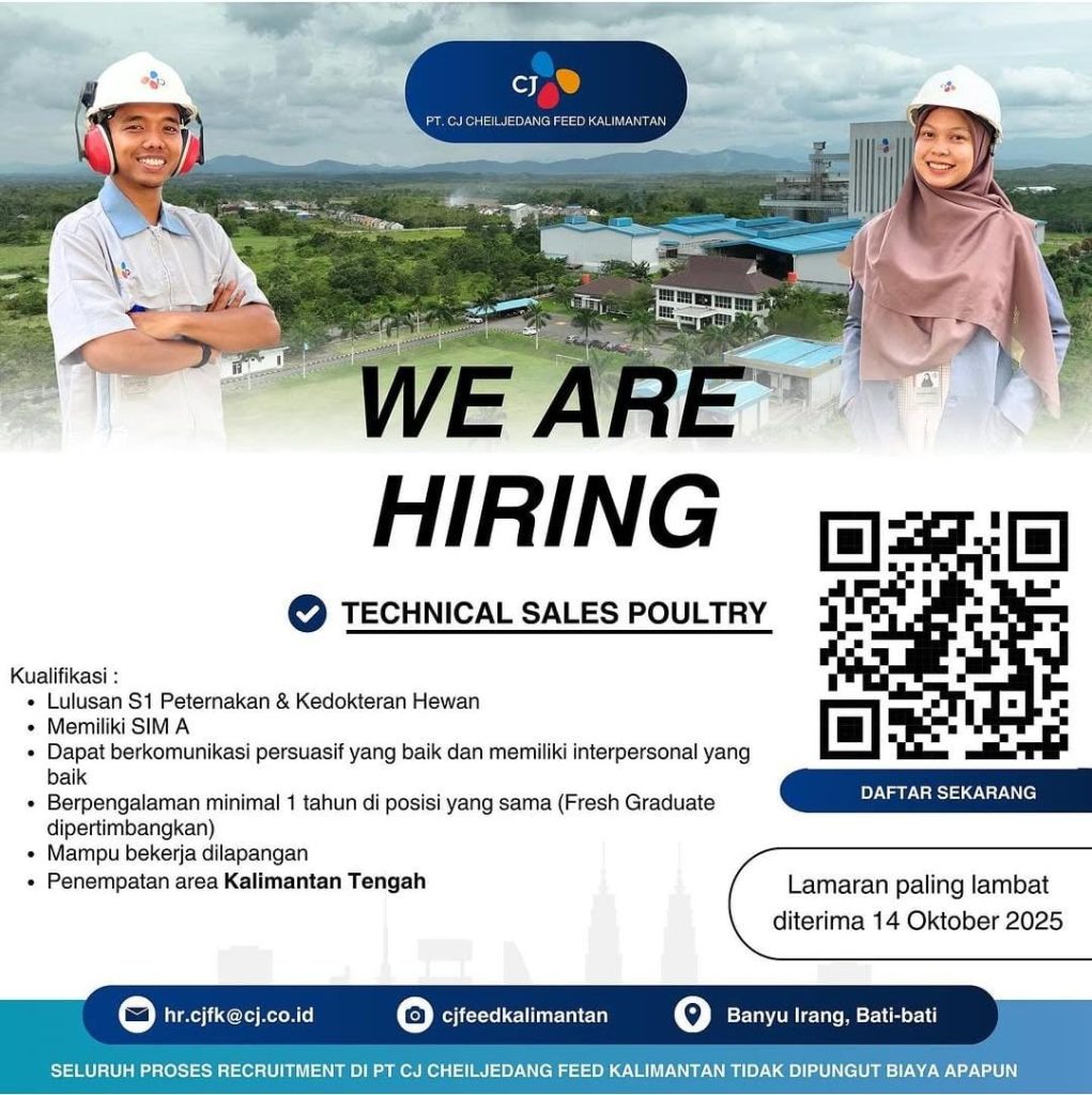 Info Loker Tanah Laut – Dibutuhkan Posisi Technical Sales Poiltry – PT. CJ Cheiljedang Feed Kalimantan