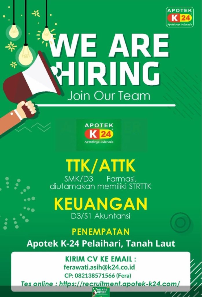 Dinas Tenaga Kerja dan Perindustrian Kabupaten Tanah Laut menginformasikan bahwa saat ini Apotek K-24 Pelaihari membuka lowongan kerja untuk posisi: