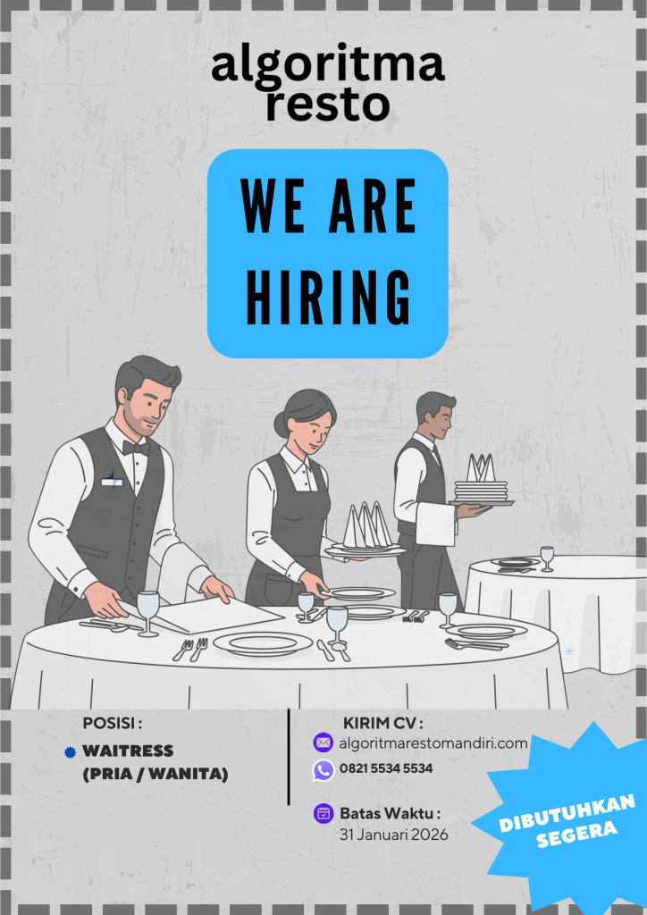 Algoritma Resto membuka kesempatan kerja untuk posisi Waitress (Pria/Wanita). Lowongan ini cocok bagi pencari kerja yang tertarik di bidang restoran, pelayanan pelanggan, serta memiliki semangat kerja dan komunikasi yang baik.