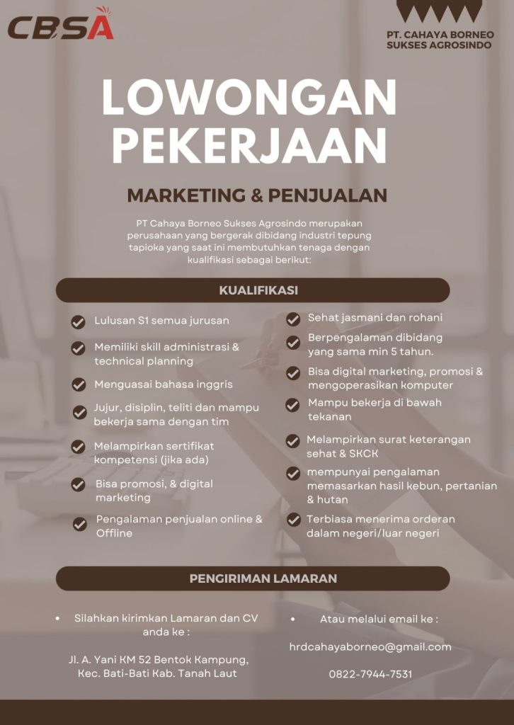 PT. Cahaya Borneo Sukses Agrosindo (CBSA) membuka kesempatan bagimu untuk mengisi formasi yang tersedia.