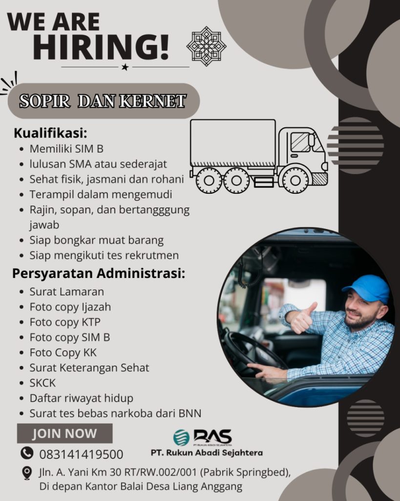 LOKER : PT. Rukun Abadi Sejahtera – Sopir dan Kernet