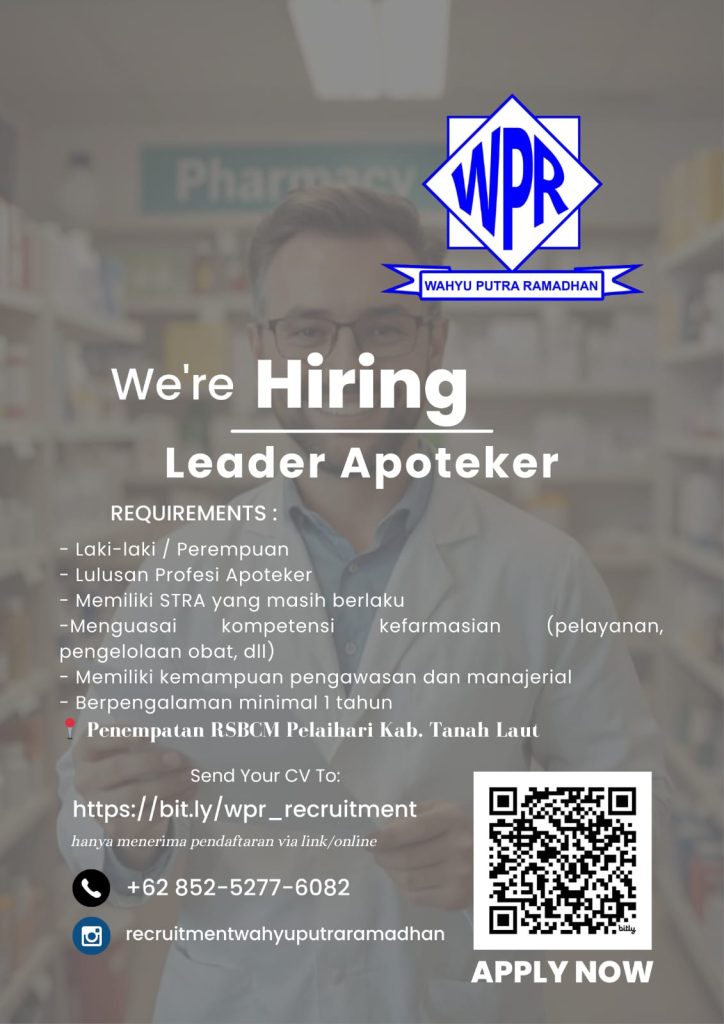 Lowongan Kerja Kesehatan Wahyu Putra Ramadhan (WPR) Tanah Laut 2026 – Posisi Leader Apoteker (Penempatan RSBCM Pelaihari)