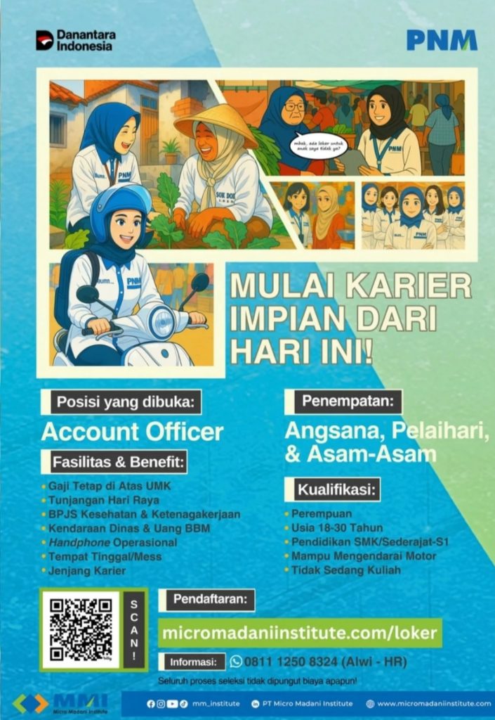 Halo #Rekanaker! Ada kabar gembira bagi Anda para perempuan tangguh yang sedang mencari pekerjaan dengan fasilitas lengkap dan jenjang karier yang menjanjikan. PT Micro Madani Institute, bagian dari ekosistem PNM (Permodalan Nasional Madani) dan Danantara Indonesia, saat ini sedang membuka lowongan pekerjaan untuk posisi Account Officer.