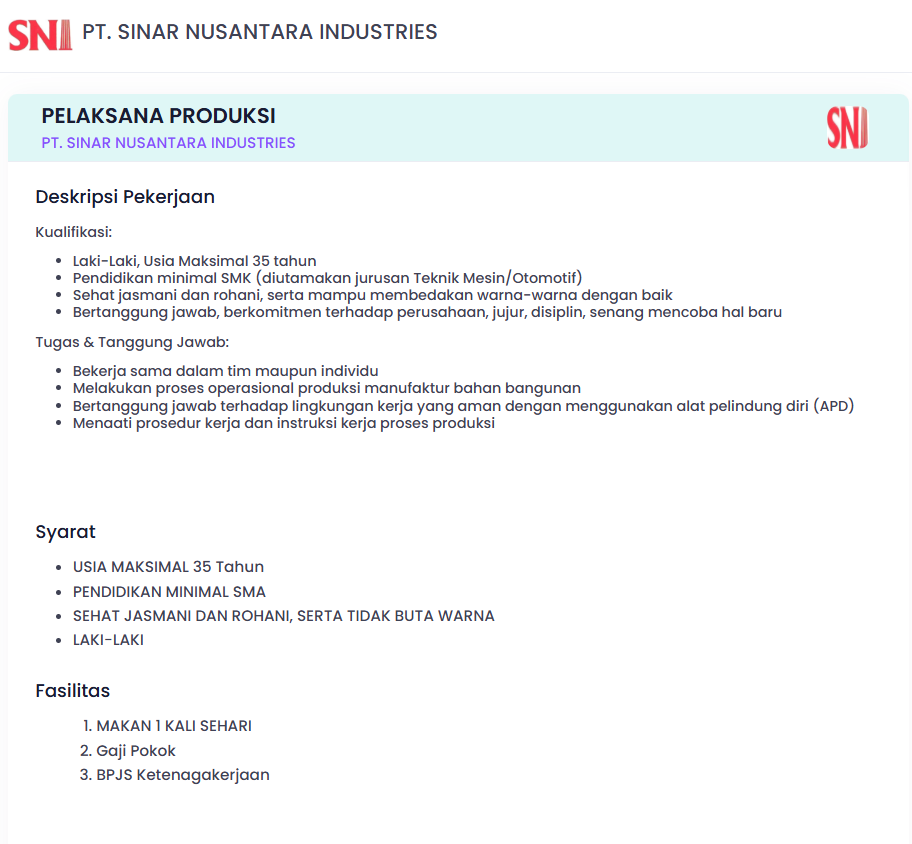 Halo #Rekanaker! Peluang kerja di sektor manufaktur kembali terbuka lebar bagi warga Kabupaten Tanah Laut, khususnya di area Kecamatan Bati-Bati. PT. Sinar Nusantara Industries, produsen bahan bangunan terkemuka pemegang merek NUSAboard dan CITICON, tengah mencari tenaga kerja handal untuk bergabung bersama tim operasional pabrik.