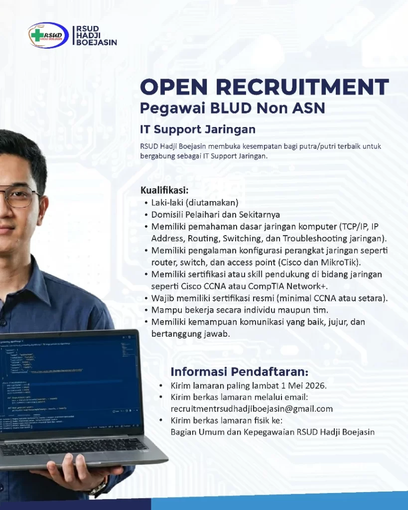 Posisi yang sedang dibuka adalah IT Support Jaringan. Ini merupakan kesempatan yang sangat baik bagi putra/putri terbaik di wilayah Tanah Laut, khususnya yang memiliki keahlian spesifik di bidang infrastruktur jaringan komputer, untuk ikut serta mendukung digitalisasi layanan kesehatan.