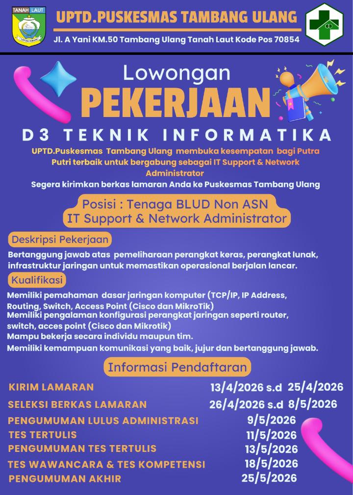 Posisi yang dibutuhkan adalah IT Support & Network Administrator, yang secara khusus diperuntukkan bagi lulusan D3 Teknik Informatika. Ini adalah kesempatan yang sangat baik untuk berkontribusi dalam memastikan kelancaran sistem informasi dan layanan digital di sektor kesehatan masyarakat Tanah Laut.