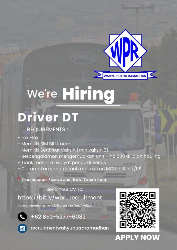 Halo #Rekanaker! Perusahaan Wahyu Putra Ramadhan (WPR) kembali membuka kesempatan rekrutmen karyawan bagi warga lokal. Lowongan terbaru ini diperuntukkan khusus bagi Anda yang memiliki keahlian di bidang operasional alat berat dan transportasi, yakni untuk posisi Driver DT dengan penempatan kerja di wilayah Asam-asam, Kabupaten Tanah Laut.