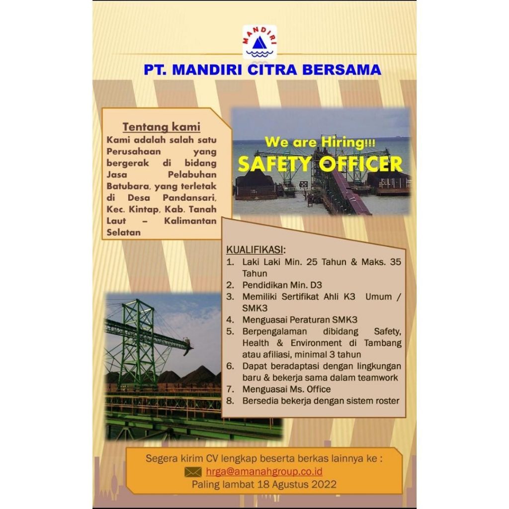 PT MANDIRI CITRA BERSAMA sedang membutuhkan tenaga kerja dengan posisi sebagai SAFETY OFFICER