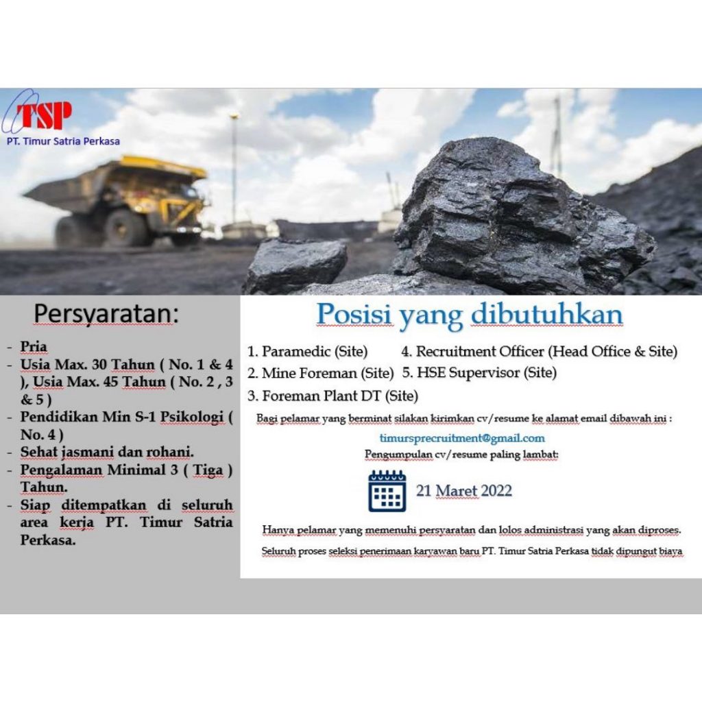 PT SATRIA PERKASA sedang membutuhkan tenaga kerja dengan posisi sebagai PARAMEDIC, MINE FOREMAN, FOREMAN PLANT DT, RECRUITMENT OFFICER dan HSE OFFICER.
