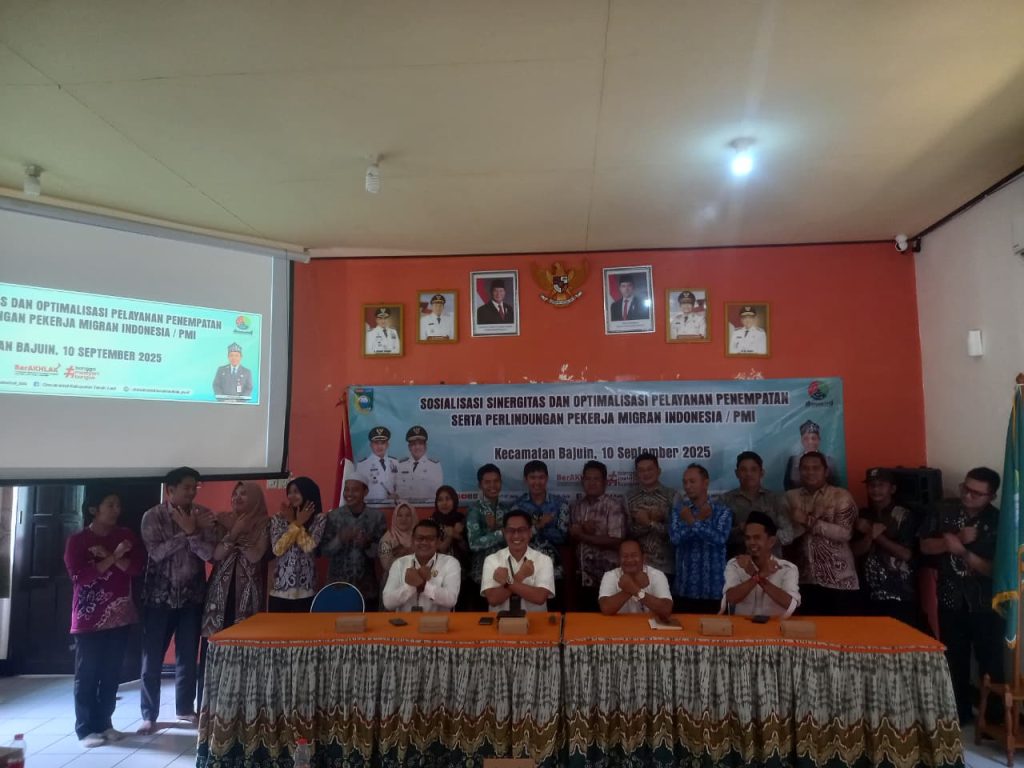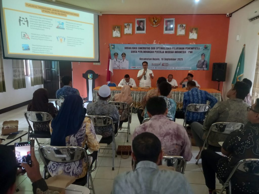 Bajuin, 10 September 2025 – Telah dilaksanakan kegiatan Sosialisasi Sinergitas dan Optimalisasi Pelayanan Penempatan dan Pelindungan Pekerja Migran Indonesia (PMI) bertempat di Aula Kantor Kecamatan Bajuin. Kegiatan ini diikuti oleh aparat kecamatan serta aparat desa yang hadir sebagai peserta.